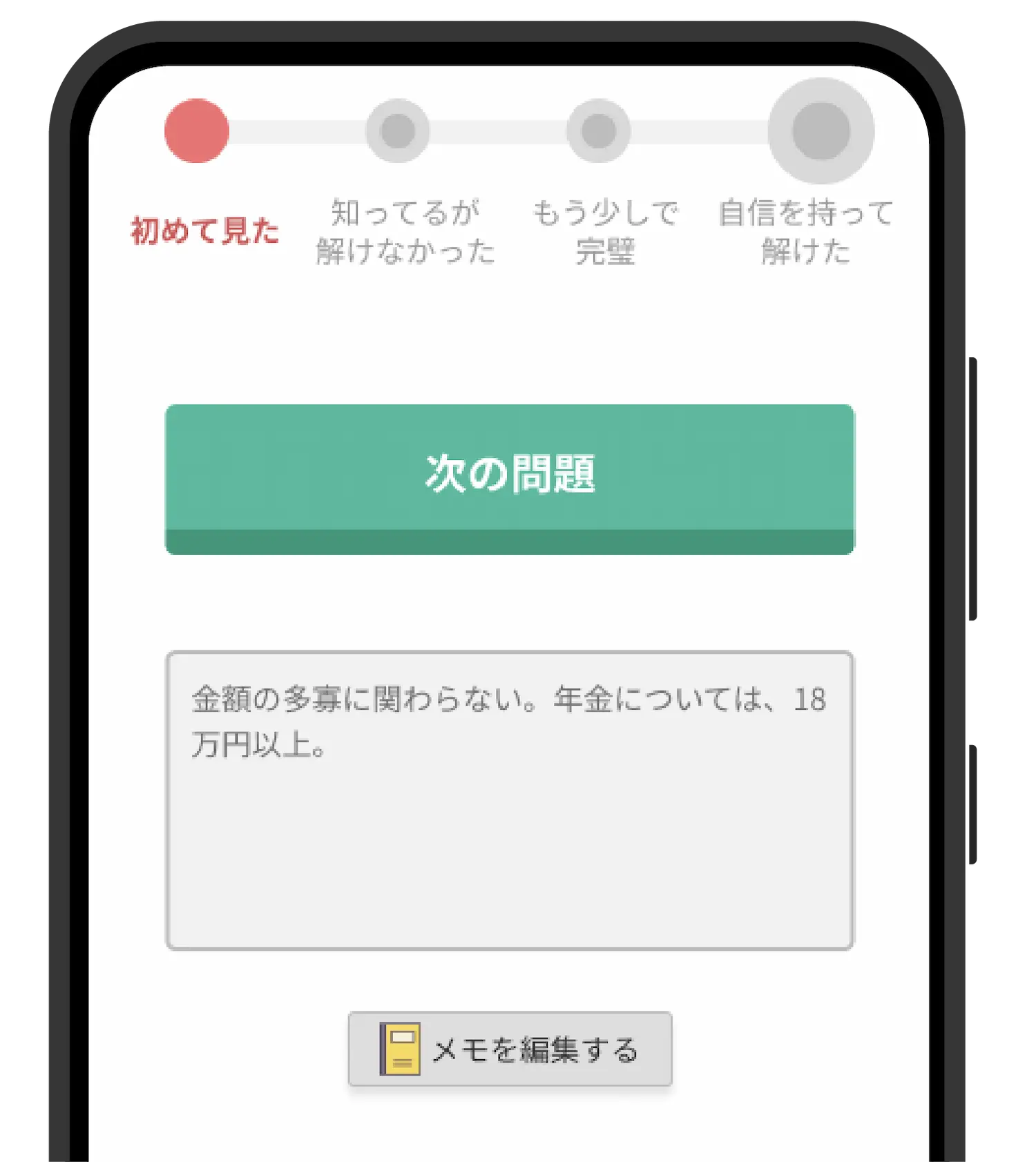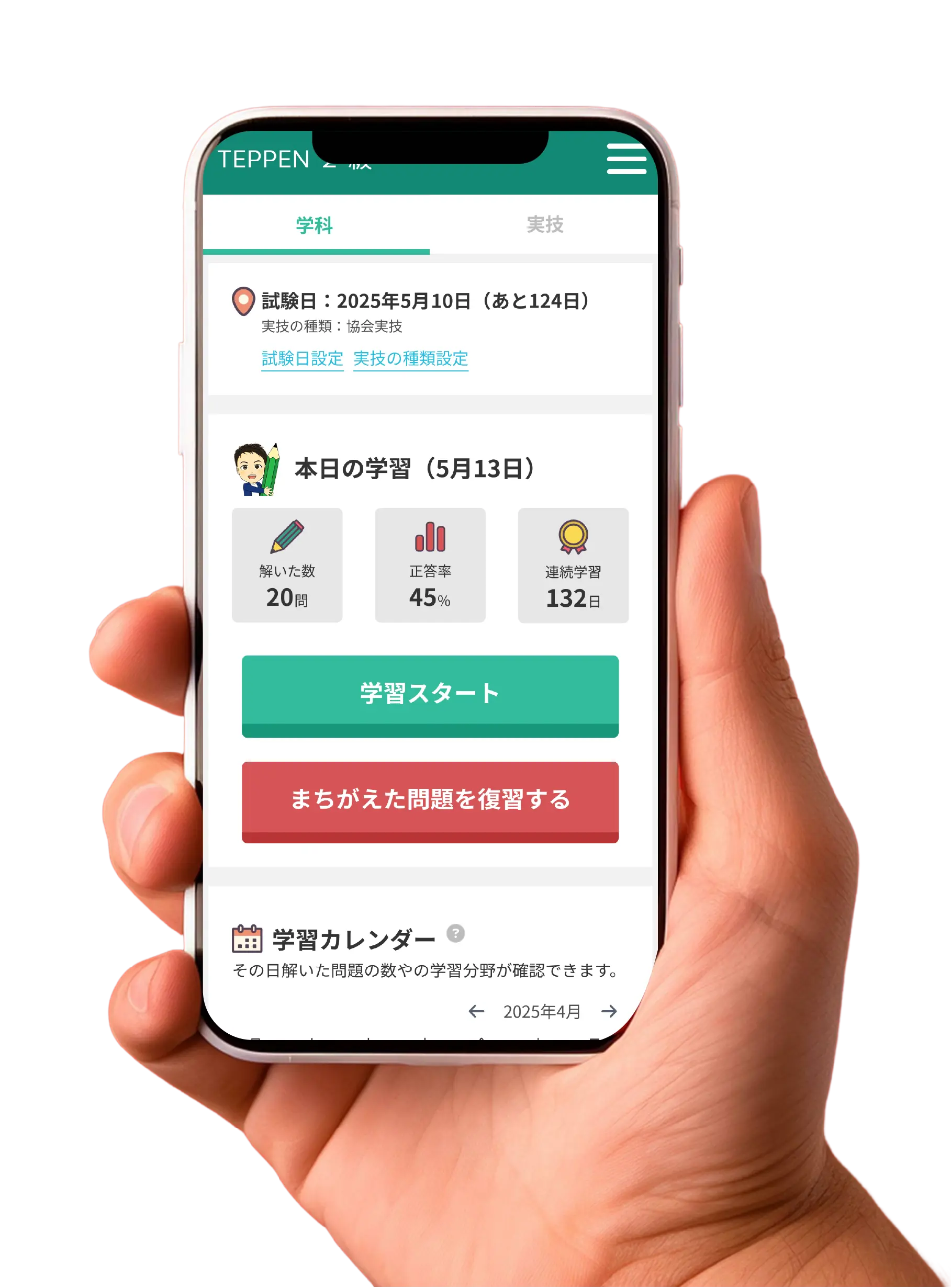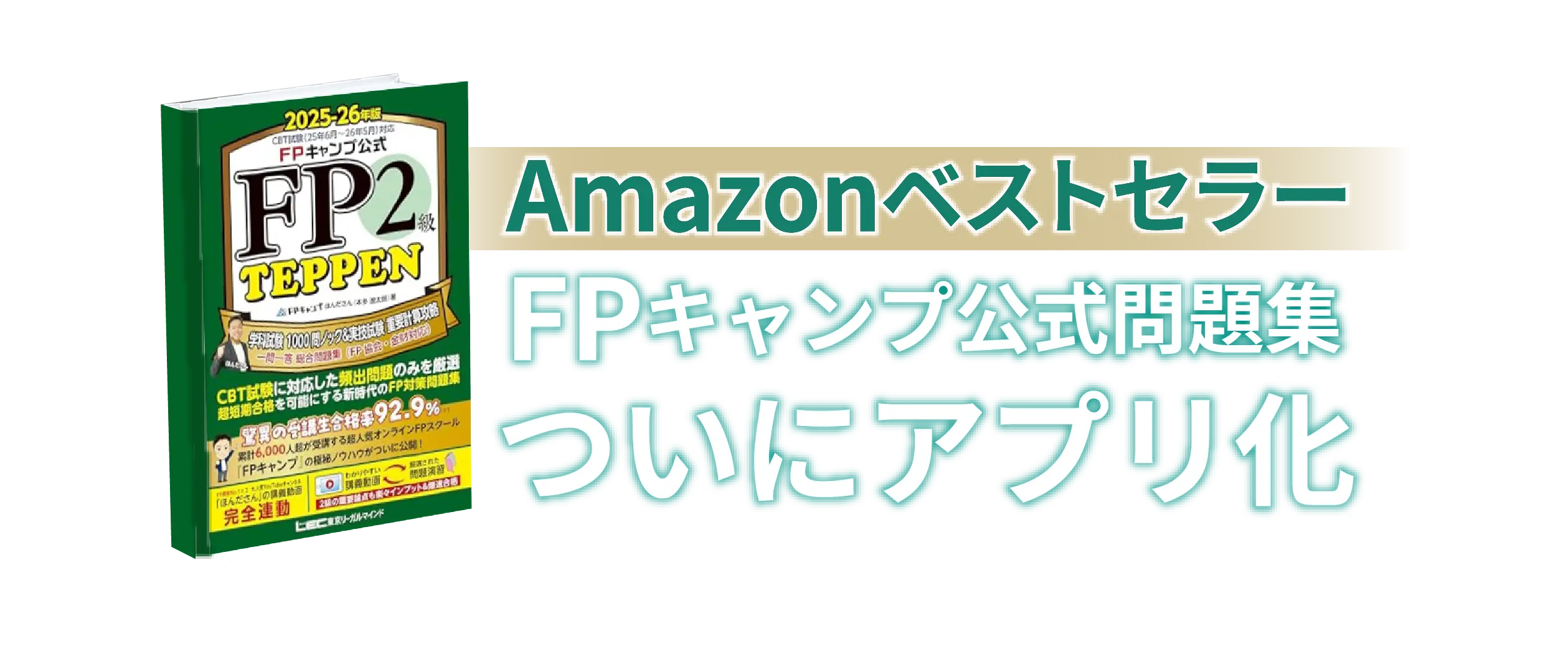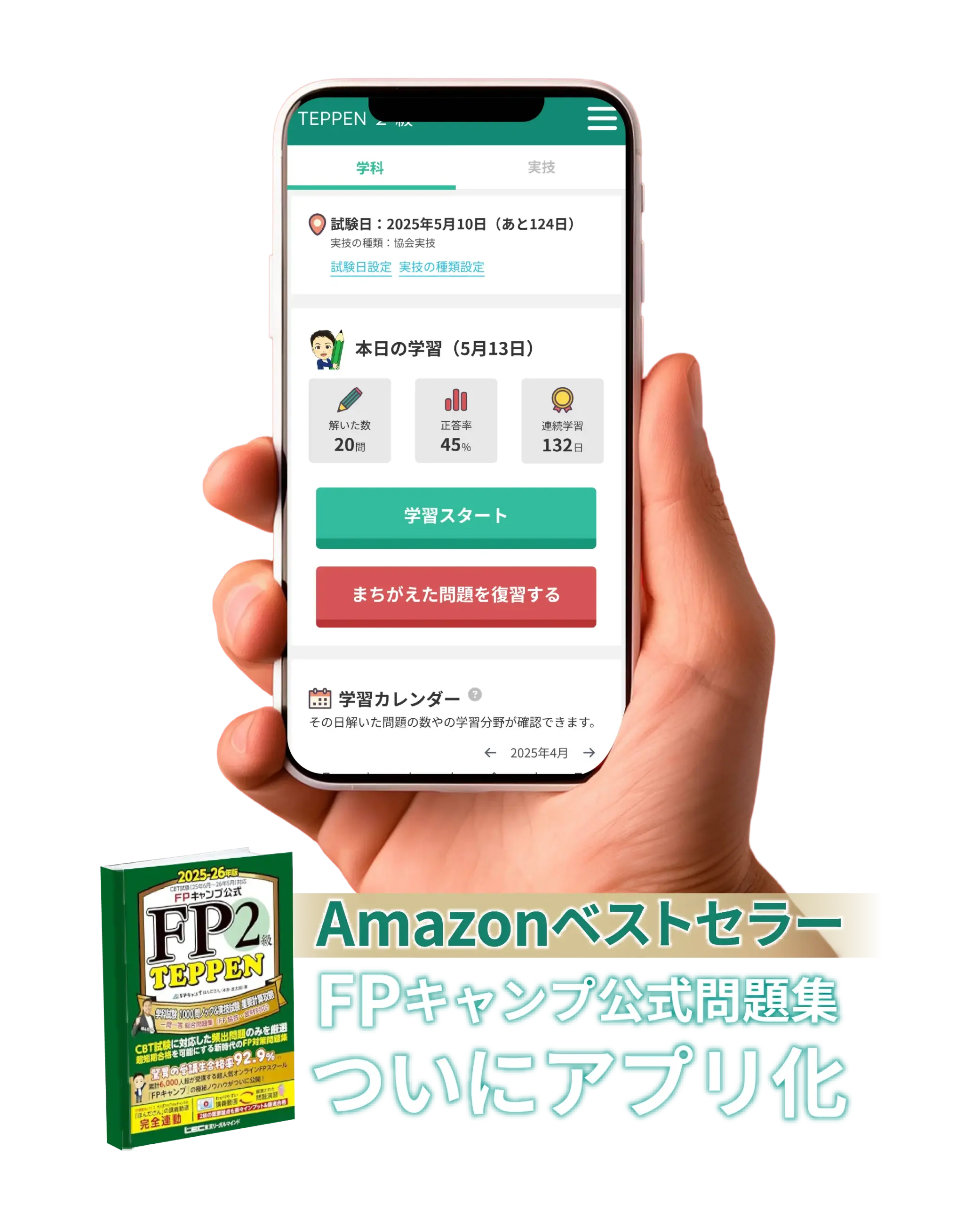 ログイン リリース記念 ・・・・ 特別割引実施中! 通常料金 1,980円 2026/3/5まで 500円 1回解いたのに覚えられない 範囲が広すぎて達成感がない 勉強を始めるまでのハードルが高い 独学のモチベーションを保てない 復習のたびに同じところでつまずく \そんなお悩みに/ TEPPEN for webは、 FP学習でつまずきやすいポイントを分析し、 続けやすく・復習しやすい形にしました。 つまずきやすい悩みを想定して、 学習の流れを設計しています ・ ・ ・ お悩み01 1回解いたのに覚えられない 苦手な問題だけを 効率的に復習 五段階の「攻略度」で問題を絞り込むことができる 書籍だけだと「どこが苦手か」を 自分で管理するのは意外と大変ですよね。でもアプリなら、苦手問題を「攻略度」で設定し、集中的に復習モードで学習することが可能です。アプリなら、得点につながる復習に集中できます。 お悩み02 範囲が広すぎて達成感がない 学習進捗が見える化され 進捗状況が一目瞭然 自分の学習ペースを ひと目で確認できます。 学習カレンダーを見れば、その日にどの分野を何問解いたかがすぐにわかります。 お悩み03 勉強を始めるまでのハードルが高い 一問一答形式で、 1問10秒から学習できる 選択式で直感的に答えられ 答えと解説もすぐ確認できる! テキストを開く気力がない日でも大丈夫!アプリなら、1問だけでもパッと出てくるので、「どこから手をつければいい?」と迷う時間がゼロになります。得点につながる復習が短時間でも可能です。 お悩み04 独学のモチベーションが保てない 成果が見えるから、 モチベーションが続く ランキング機能はありますが、 自身のペースで学習できます。 独学は孤独な戦いになりがちです。ですが、全国には同じく合格を目指して努力する仲間がいます。ランキング機能を通じて、全国の仲間と競い合い、高め合いましょう。 お悩み05 復習のたびに同じところでつまずく 「どこが弱点か」を メモに残せる 得点につながる復習が可能! つまずいた問題に「なぜ間違えたか」を メモに残しておくことで、次の学習で つまずきポイントを効率的に見直すことができます。 そして TEPPEN for webは、 「今の試験で本当に必要な問題」だけを収録 過去5回分の試験を分析し、 直近の出題傾向に合わせた重要問題だけを厳選。FP試験は、経済情勢や法改正によって出題内容が少しずつ変化します。そのため、古い過去問だけでは今の試験に合わないケースも少なくありません。ムダなく解いて、実力アップにつなげられます。 人気YouTube講義と連動。理解から実践演習までを一本化。 「ほんださんの講義で理解」 「アプリで反復・得点アップ!」 学習ステップが一つにまとまることで、 忙しい方でも迷わず合格に向かえます。最短で正しい学習をしたい人ほど メリットを感じる構成です。 独学を手助けする アプリの機能 試験日設定 学習進捗 学習カレンダー ランキング 出題問題絞り込み 問題の攻略度 メモ機能 FLOW ご利用までの流れ アカウント登録 登録は約1分の入力で終わります。 問題集を購入 ご希望の学習プランをお選びください。 学習開始! 購入後すぐに始められます! リリース記念 ・・・・ 特別割引実施中! 一度の購入で2026年5月31日まで使い放題 ※法改正の関係で6月上旬まで引き続き ご利用いただける可能性があります。 通常料金 1,980円 2026/3/5まで 500円 PRICE サービス料金 FP2級の「学科」と「実技」の2科目は 目的に合わせてプランを選べます。 おすすめ 2級合格スタンダードプラン 学科・実技問題 問題数:1,340問 通常料金 1,980円 2026/3/5まで 500円 FP2級合格を目指すならこれ。学科から実技までを 一気にカバーできる完全プラン。すべての分野をまとめて演習できます。 学科対策プラン 学科・全分野 問題数:986問 1,800円 基礎編の全問題を収録したパックです。 ※分野ごとの単品購入有 実技対策プラン 実技・全分野 問題数:354問 500円 応用編の全問題を収録したパックです。 Q&A よくある質問 Q. 収録されている問題は書籍版と同じですか? A.一部異なります。現在は、書籍版の計算問題や画像を含む問題を除いた内容を収録しています。書籍の構成をもとに、Web学習に最適な問題を厳選して収録しています。 Q. 法改正には対応していますか? A. はい。毎年6月に実施される法改正に合わせて、問題内容を更新しています。常に最新の制度・基準に基づいて学習できます。 Q. 購入後はスマートフォン以外でも利用できますか? A. はい。スマートフォンだけでなく、iPadやPCなどの端末でもご利用いただけます。ブラウザが使える環境であれば、どこからでも学習可能です。 Q. 支払い方法は何が使えますか? A. クレジットカード、PayPayに対応しています。 Q. 購入後の有効期限はありますか? A. はい。ご購入日から翌年5月末ごろまで、全ての機能を制限なくご利用いただけます。更新時期が近づきましたら、アプリ内でお知らせをお送りします。 Q. 対応している実技の種類を教えてください。 A. FP協会、きんざ